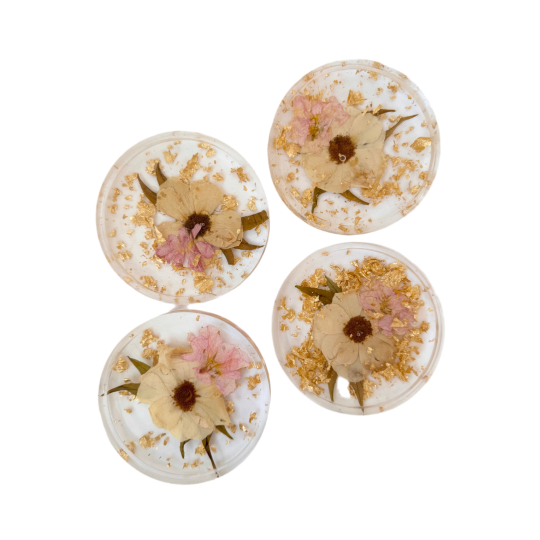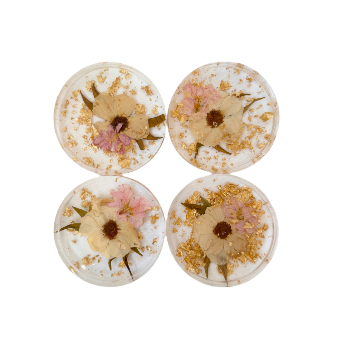 This set of four 4-inch resin coasters is an example of what your flowers would look like once preserved with Florielle. Each coaster is handcrafted with your real flowers and optionally accented with shimmering gold flakes, creating a functional yet timeless keepsake.